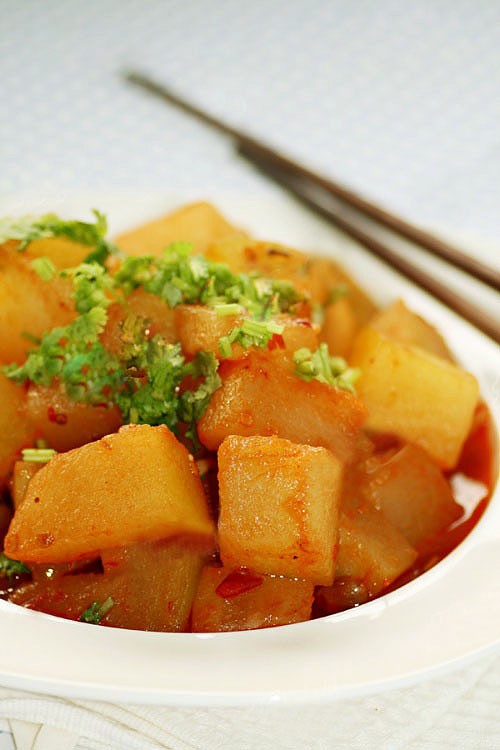 4、待豆瓣炒香后放入冬瓜翻炒均匀后倒入素高汤或清水,盖上锅盖焖2、3分钟至收汁,起锅前调入少许味精和香菜即可