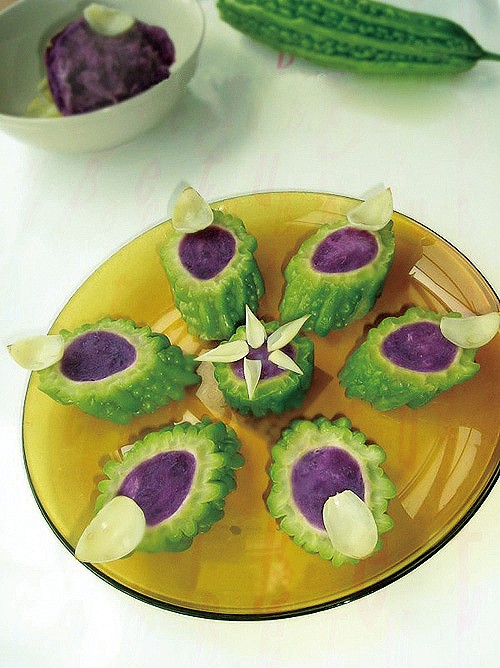5.将紫薯瓤放入苦瓜芯中,放上百合,摆好盘儿即可。