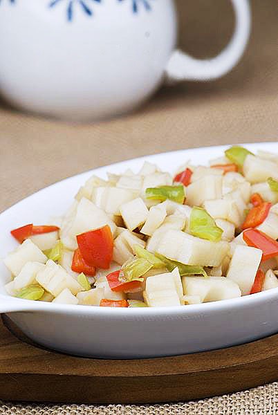 2、锅里放少许油、青红椒、藕丁,炒一下,放入醋、糖、放点水焖一下,然后,生粉水勾芡,加盐出锅。