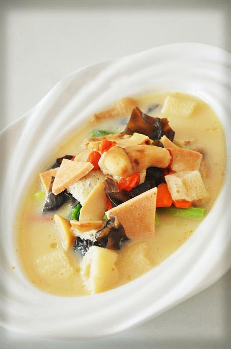 锅中放入1小勺色拉油,烧热放入香菇丝和少许姜丝炒香(小熊用的姜粉),然后加入素高汤烧开,调入少许水淀粉烧至浓稠。冷却的芦笋装盘将浓稠的汤汁淋上即可。