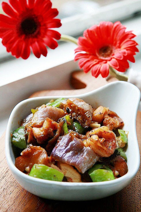 3,水开后放入糖,大火滚上一会后,放入切成滚块的尖椒和少量蒜片,等到汤快收完后倒入湿淀粉勾芡就做好了!