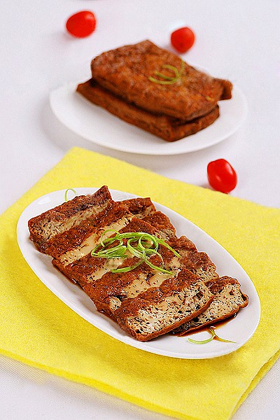 7、把豆腐放入碗中,再倒入锅内的卤汁,浸泡3小时以上,再斜切成片即可。