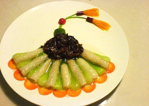 塞进竹笙里面 上蒸箱蒸20分钟,针磨炒香,菜心跟胡萝卜用盐水烫一下出锅