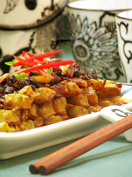 5:锅留底油,加入老干妈豆豉再翻炒片刻。