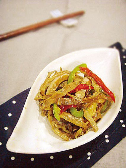 6、下笋干,翻炒至炒得动,炒得过程中可以加水炒