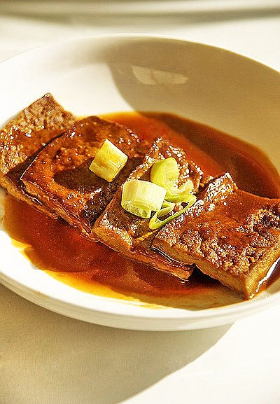 做法:豆腐切厚片,在平底锅中用油煎至两面金黄。另取一锅,加水、素蚝油、老抽、糖煮开,放入煎好的豆腐小火炖煮一会即可。
