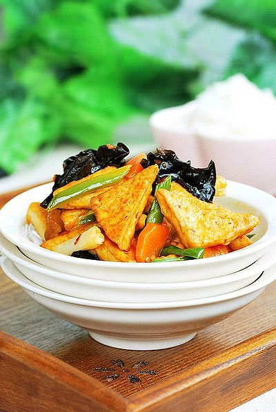 【材料】北豆腐350克干木耳8克胡萝卜30克