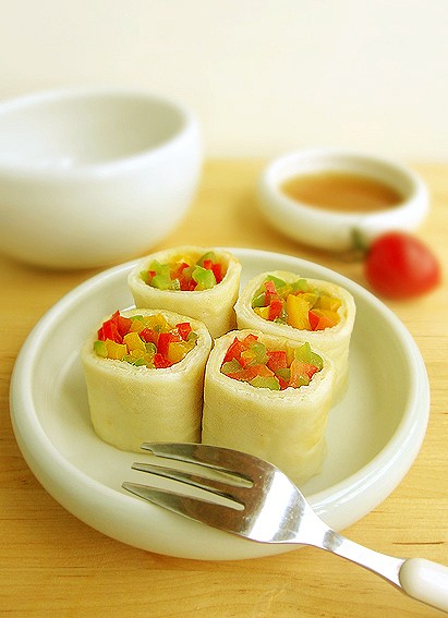 5.把煎好的饼放在竹帘上,再放上彩椒丝,尽可能的多放些,卷起,切段装盘,蘸调味汁吃。