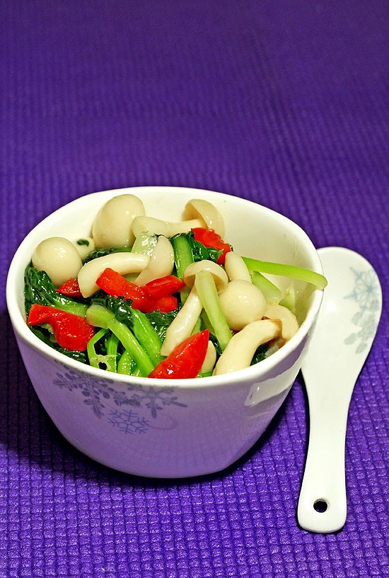 (6) 原锅内加入少许精制油,放入少许姜末煸香,倒入塌棵菜、白玉菇、红椒翻炒片刻加盐、蘑菇精(代替味精)调味,拌匀迅速勾一点点薄芡,淋几滴橄榄油出锅装盘即可。