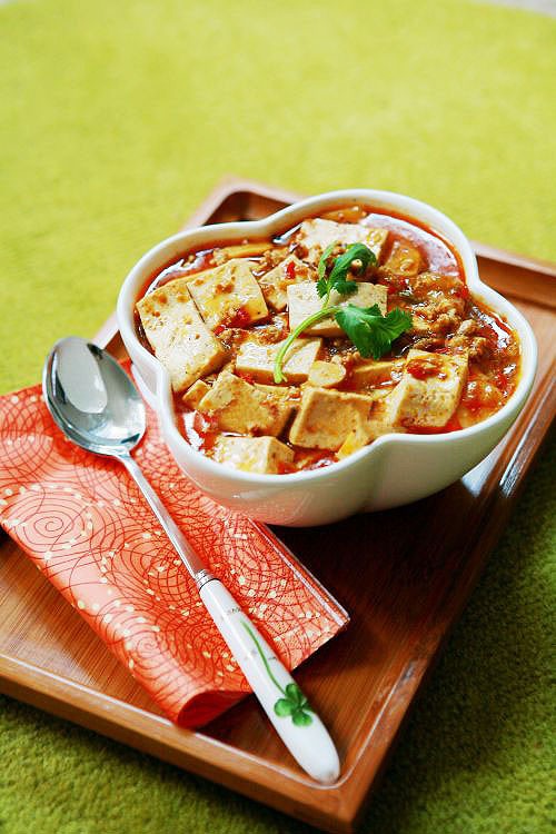 配料:豆腐,素肉末,姜末,陴县豆瓣酱,酱油,糖,蘑菇精,花椒,辣椒,花椒粉