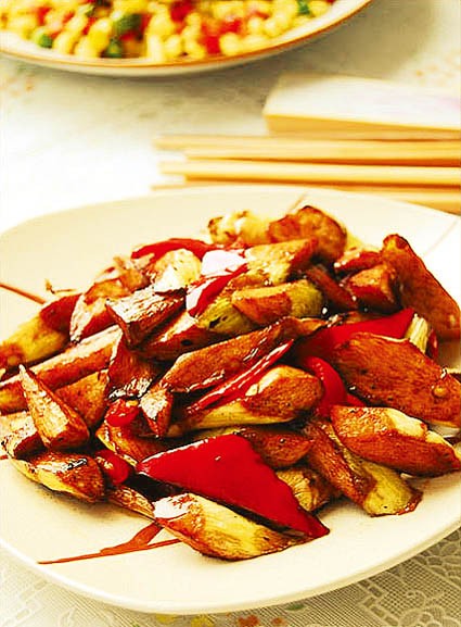 ★锅内放油烧热,下茭白块、红椒条、慢慢翻炒,让油渗透到茭白块中