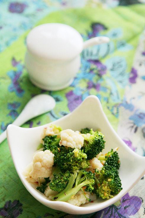 材料:菜花,西兰花,大蒜,盐,蘑菇精,辣椒油,糖