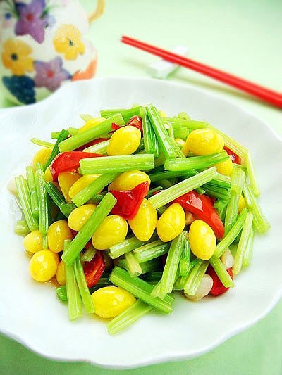 原料:白果80克、芹菜250克、红椒半个、盐、味精、白糖、姜末适量。