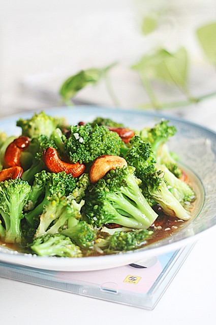然后洒上盐、淋上少许素耗油,炒锅里油4成热的时侯丢几颗腰果炸一炸,等腰果变成金黄色,端起锅子,连油带果一起浇到菜上面,伴随着“刺啦”一声响,拌匀,此菜大功告成。