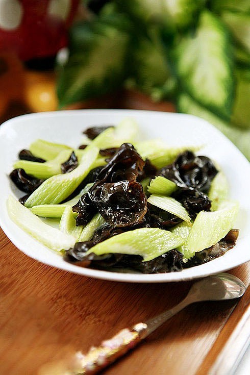 2,起锅倒油,油热后放入西芹和木耳翻炒,调入适量的盐和蘑菇精,翻炒大约两分钟就做好了!
