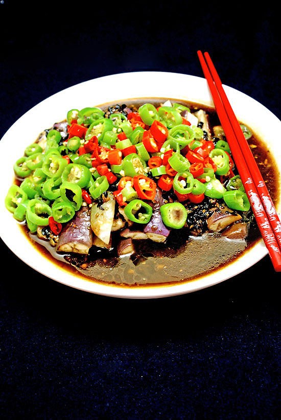 (7) 起锅, 锅内加少许油,煸香红绿米椒圈,放在蒸好的茄子上面即可。
