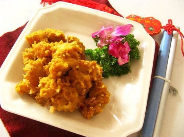 另起锅将素蛋黄加少许南瓜泥炒热放入炸好的南瓜炒匀撒上花生末即可。