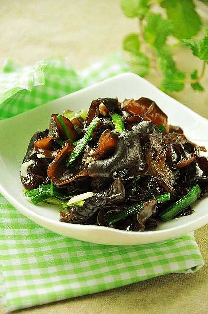 1、锅中放入泡发好的黑木耳翻炒1分钟