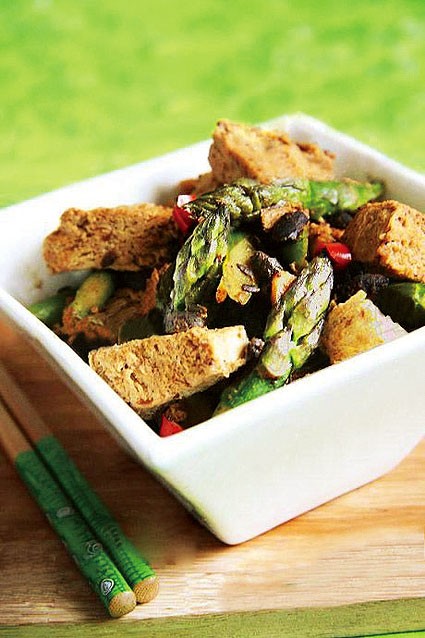 原料:芦笋、冻豆腐、豆豉、小红辣椒。