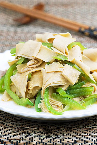 【原料】干豆腐3张(也叫豆腐皮)、尖椒3根、姜碎若干、花椒粉若干、生粉水、生抽、盐