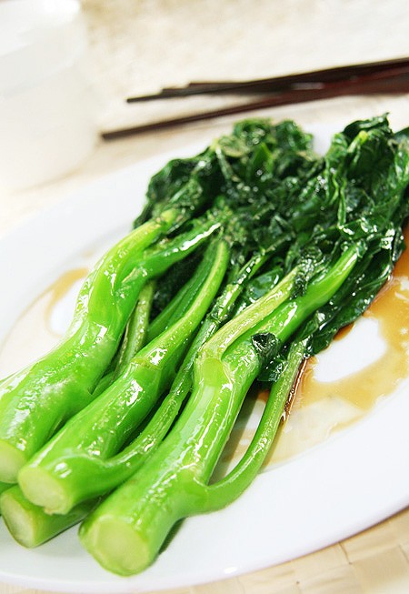 1、芥蓝洗净去老根,先将根部放入沸水中焯烫一下,捞出迅速放入冰水中。
