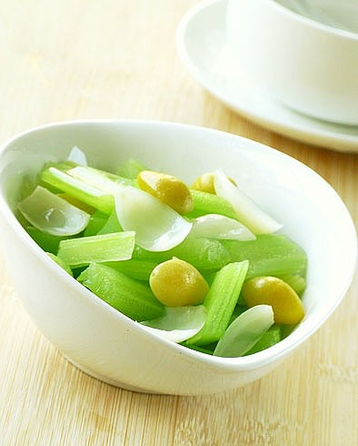 4 炒锅烧热后加入植物油,油温至六成热左右下西芹煸炒;