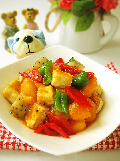3、直接放入红椒翻炒,接着放入水果,最后倒入调味汁翻炒入味即可。