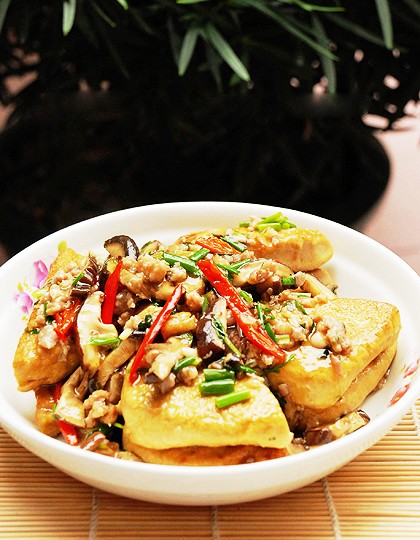 5.倒入切好的香菇炒出香味。倒入煎好的豆干。