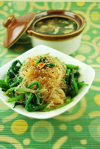 原料:菠菜一小把、粉丝一小捆、盐、生抽一匙、醋半匙、素蚝油半匙、糖少许、芝麻适量、油辣子1勺。