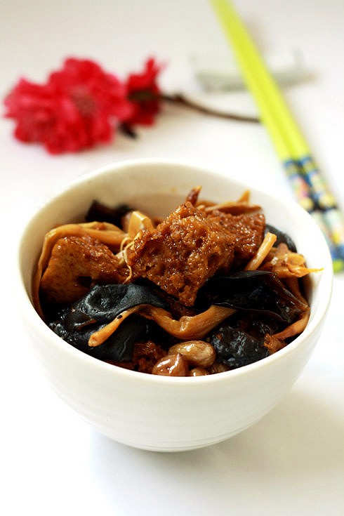 原料:烤麸100克,香菇10朵,木耳5克,黄花菜10克,姜5克,花生米50克