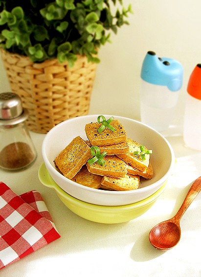 3.把豆腐取出.锅内留一点油,喜欢吃辣的这时放入干辣椒段炒香,再放入豆腐片翻炒,加椒盐,白胡椒粉,撒香葱末炒匀就好了,我加了现磨的黑胡椒碎~