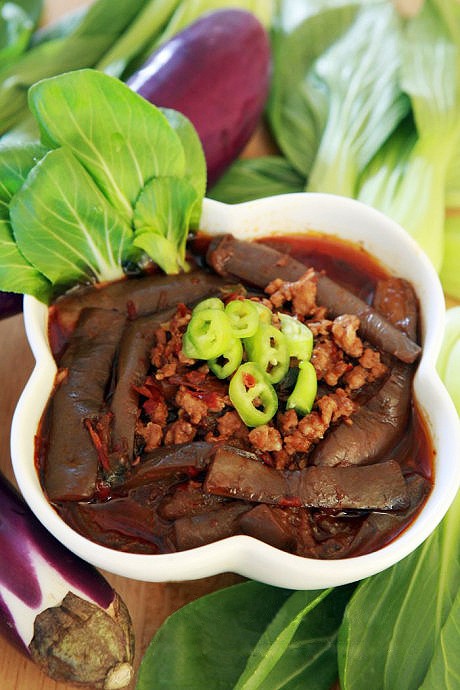 材料:茄子,素肉馅,姜,蒜,郫县豆瓣酱,花椒,花椒粉