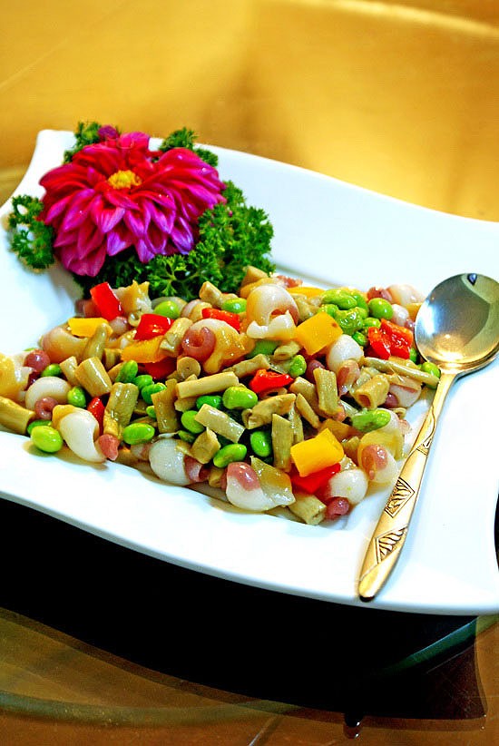 原料:素黄螺、扁尖笋、黄甜椒、红甜椒、毛豆子