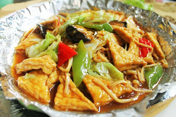 3、 铁板加热后上面铺上锡纸、将煮好的豆腐装入铁板中即可。