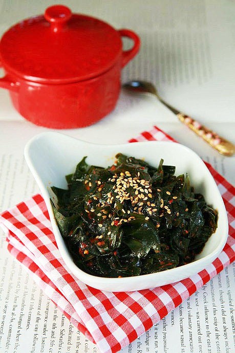 材料:裙带菜,韩国辣椒酱,花椒油,盐,辣椒油,芝麻