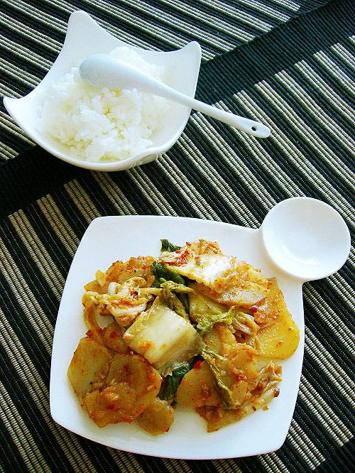 3,起锅倒油,油热后放入辣白菜翻炒,炒出香味后放入处理后的土豆片翻炒均匀就做好了。