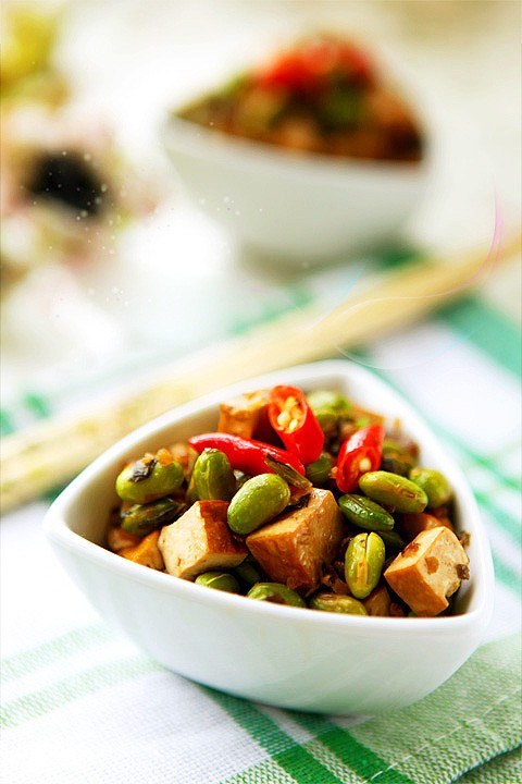 【原材料】* 素肉末50克、毛豆米150克、香干3块、雪菜适量、红椒1-2个、干红椒随意、姜3克。