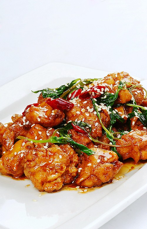 6. 另起锅,锅入倒入油,放入姜片煸炒,再放进干辣椒、猴头菇炸块,加入水、老抽、蘑菇精、糖调味。调中火烧,再放进九层塔,勾一点点薄芡,最后淋香油(麻油)拌匀出锅装盘,撒少许熟白芝麻即可。