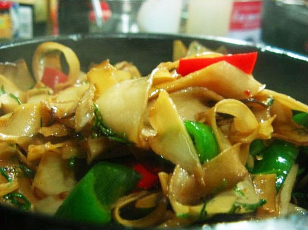 3、另起锅放入少许油、加入副料煸炒出香味、加入炸好的菇片、加入调味料、加少许水略煮一下