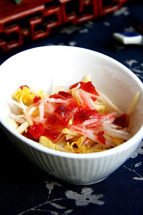 5、将炒红果浇在白菜丝和鸭梨丝上,一拌即可