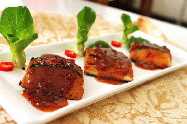 3、净锅放入少许油、放入剁辣椒、煸炒出香味后、放入少许水加入其它调味料煮开后味道调好(甜酸辣)、勾少许芡汁,出锅淋在素鱼排上、再将柠檬切开挤上几滴柠檬汁在做好的素鱼排上即可。
