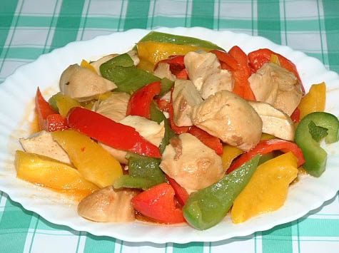 4、爆炒三色椒至略软,再加入素鸡片兜炒,埋芡即可上碟