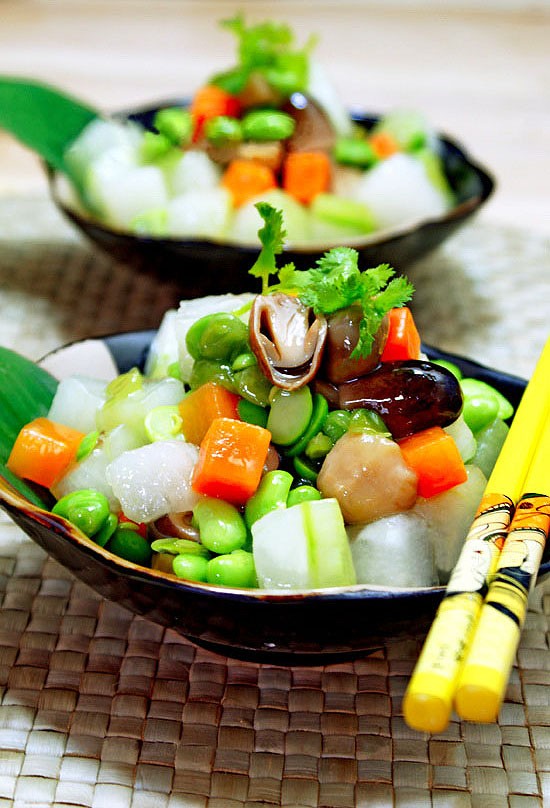 (5)起锅,锅里放少许油,煸香姜末,放入冬瓜煸炒,加少许水略炒一会儿,加胡萝卜继续煸炒,炒致冬瓜呈半透明状,放入草菇及毛豆,翻炒几次,加少许盐和素易鲜(代替味精)调味,勾一点点薄芡淋几滴麻油出锅装盘即可。
