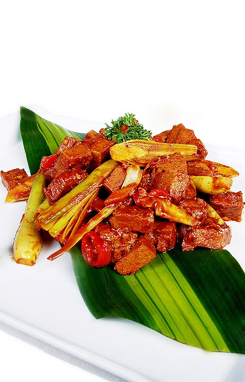 5.炒锅烧热加少许油,倒入姜片、香茅、红椒圈煸香,然后放入素牛仔方粒、沙嗲酱、泰国辣椒酱、咖喱炒散炒匀。加少许水,加盐、蘑菇精、淋几滴青柠檬汁,略微烧一会儿,让菜肴入味,不勾芡,滴几滴橄榄油出锅装盘即可。