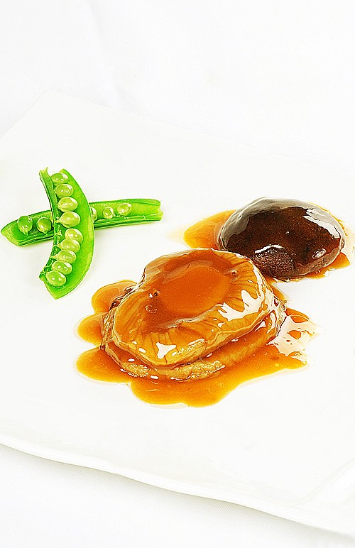 5.将甜豆放入锅内,加入水、精盐、糖、油烫一下,捞出摆于盘内。再将烧好的白灵菇素鲍鱼、香菇起锅,摆于盘中间。