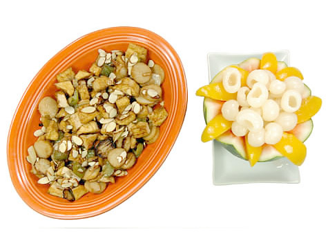 然后加入炒好的豆腐及烤过的杏仁片。拌匀后调味。