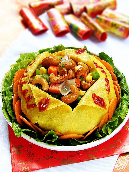 4、将素蛋皮先放入碗内,再倒入蔬果等,用一条烫熟的韭菜扎紧蛋皮口。