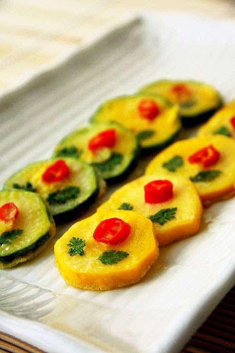 材料:绿色、黄色西葫芦,盐,香菜,辣椒,面粉