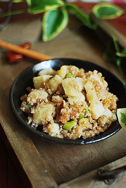 5】等水慢慢浸透面粉,用铲子翻炒均匀