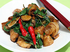 3、锅子加热后倒入香油,加入姜片爆香,再加入辣椒略微炒过后,随即加入其它调味料(除了九层塔之外),快炒至香味出现,放入炸好的面肠拌炒均匀,熄火后加入九层塔拌匀,起锅装盘即可。